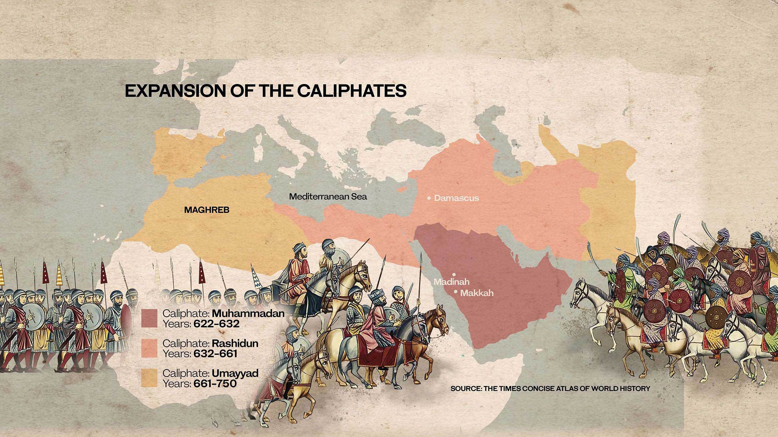 The conquest of Iberia had taken place under the auspices of the Umayyad caliphate, the second of the caliphates to be founded after the death of the Prophet Muhammad. By 750, the caliphate, based in Damascus, had established one of the largest empires the world had ever seen, stretching from Persia in the east to North Africa and Iberia in the west. But it came crashing down in 750 when the Abbasid dynasty in Baghdad rose in rebellion and nearly every member of the Umayyad dynasty was massacred.