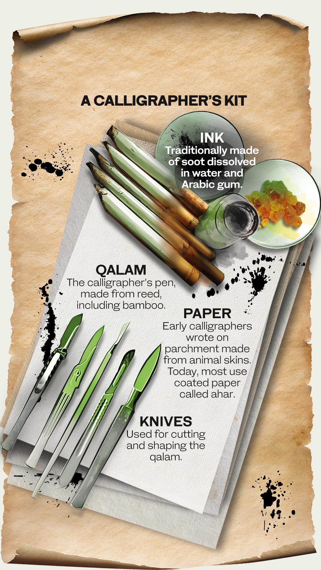 He, like the majority of calligraphers, relies on essential tools that have not changed much throughout history — the reed pen (qalam), a selection of knives (for cutting the reed or bamboo), various inks (traditionally made of soot dissolved in water and Arabic gum), and the parchment or paper on which to write.