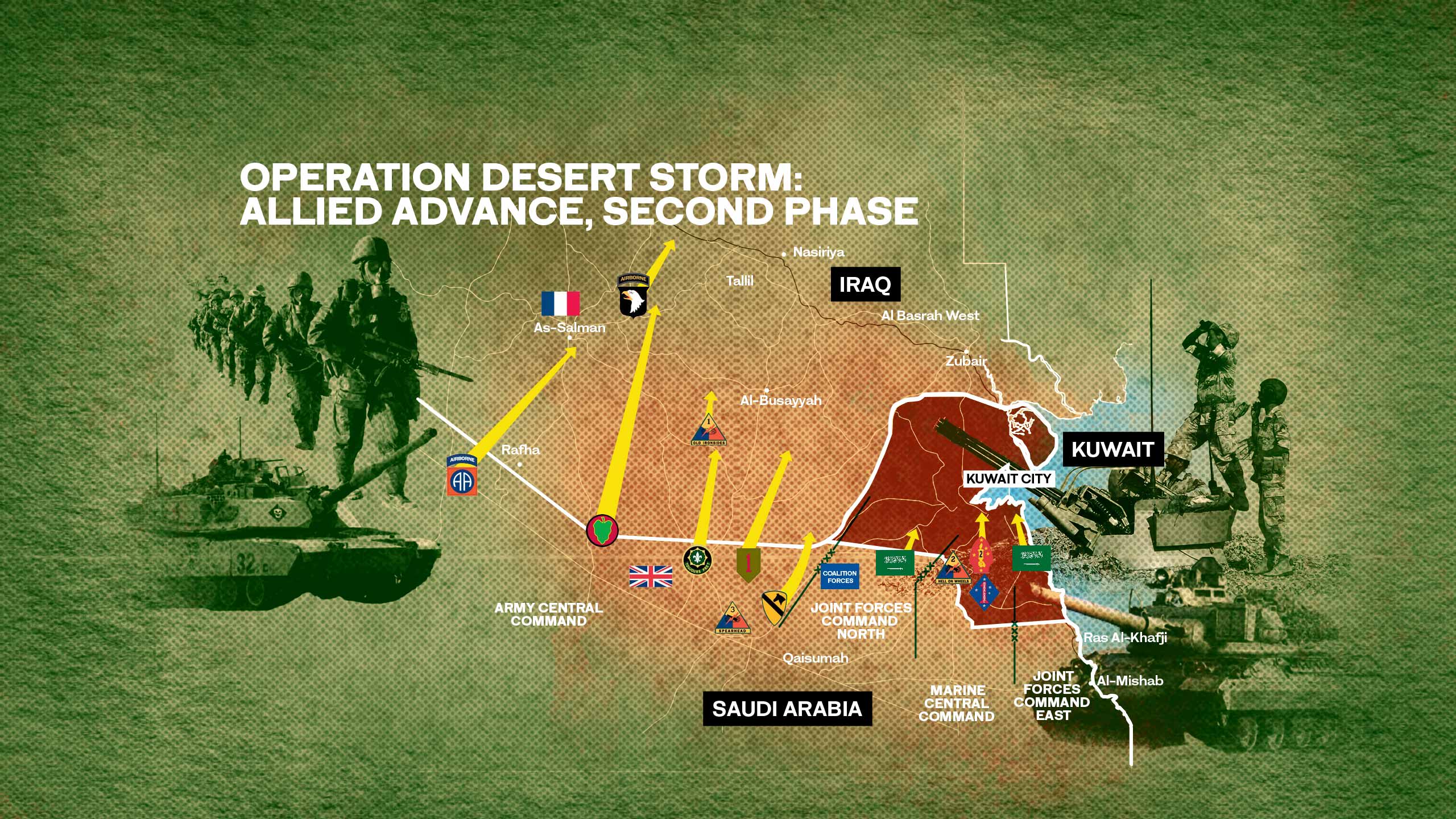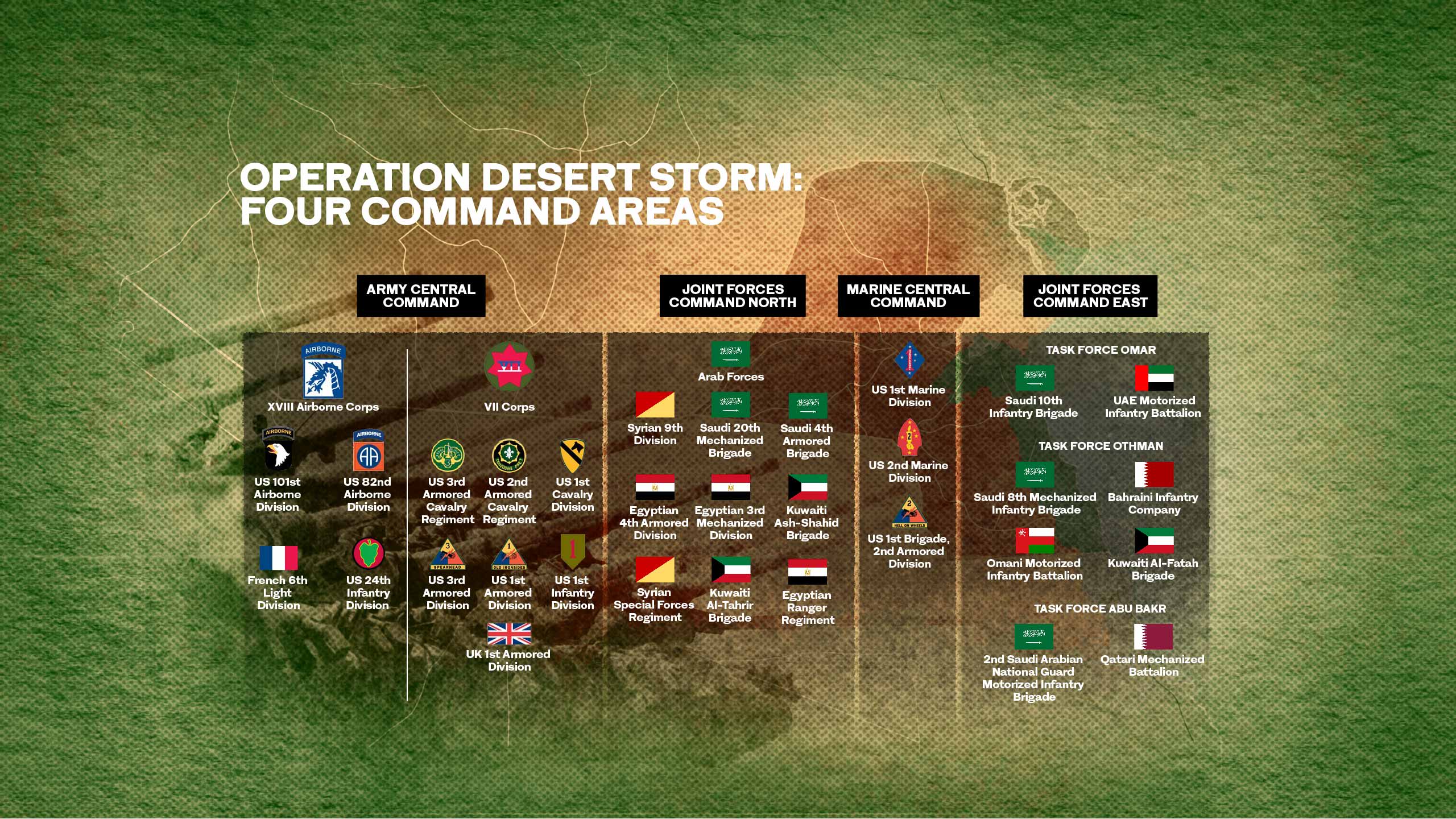 Massed in the center on the Saudi border with Kuwait were elements of the Arab forces. Saudi and Egyptian armored and mechanized infantry divisions, Syrian infantry and special forces and Kuwaiti brigades “encountered Iraqi fire trenches, minefields, barriers and harassing fires as they crossed the border in their zone,” but quickly overwhelmed the Iraqi defenses.