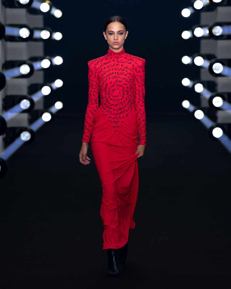 The Saudi label showcased its “Hejaz” collection, paying tribute to the Kingdom’s western province. Creative head Mohammed Khoja offered up monochrome full-length dresses, knit cardigans, and silk button-downs emblazoned with Arabic print in a circular formation that picked up on design cues from his 2024 “Petroglyphs Collection.”