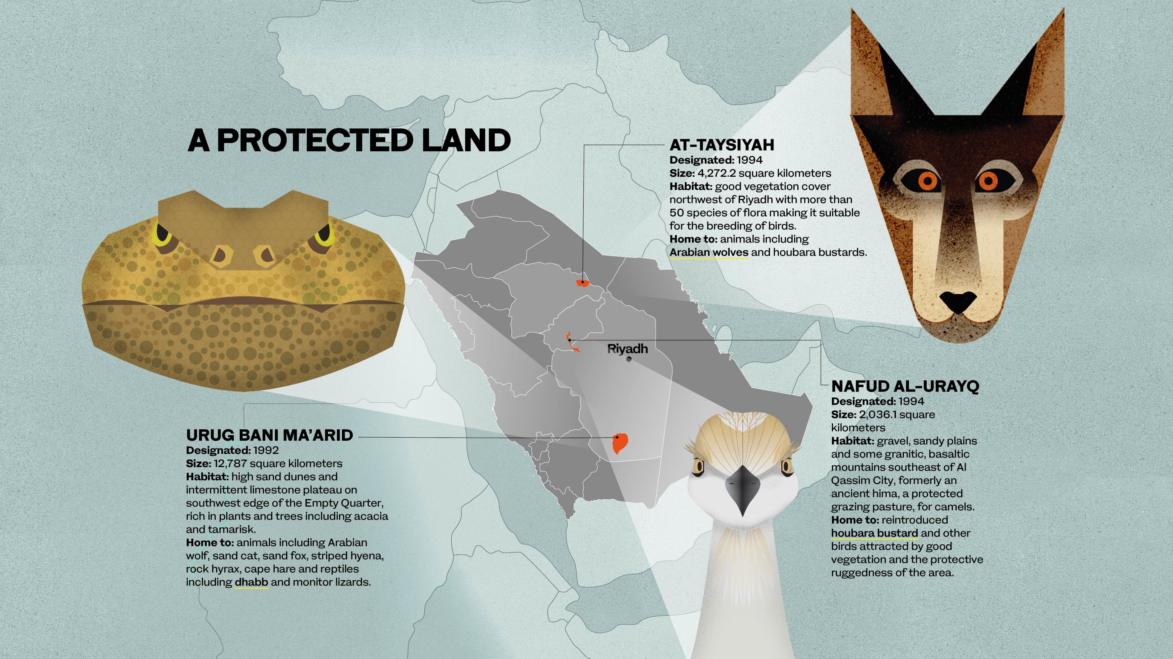 The first protected conservation area in Saudi Arabia was established in 1986: a 13,775 square kilometer reserve at Harrat Al-Harrah in the north of the Kingdom. Now it is home to a dazzling array of important animals, including the reem gazelle, Arabian wolf, red fox, sand fox, striped hyena, Cape hare, jerboa, houbara bustard and golden eagle.