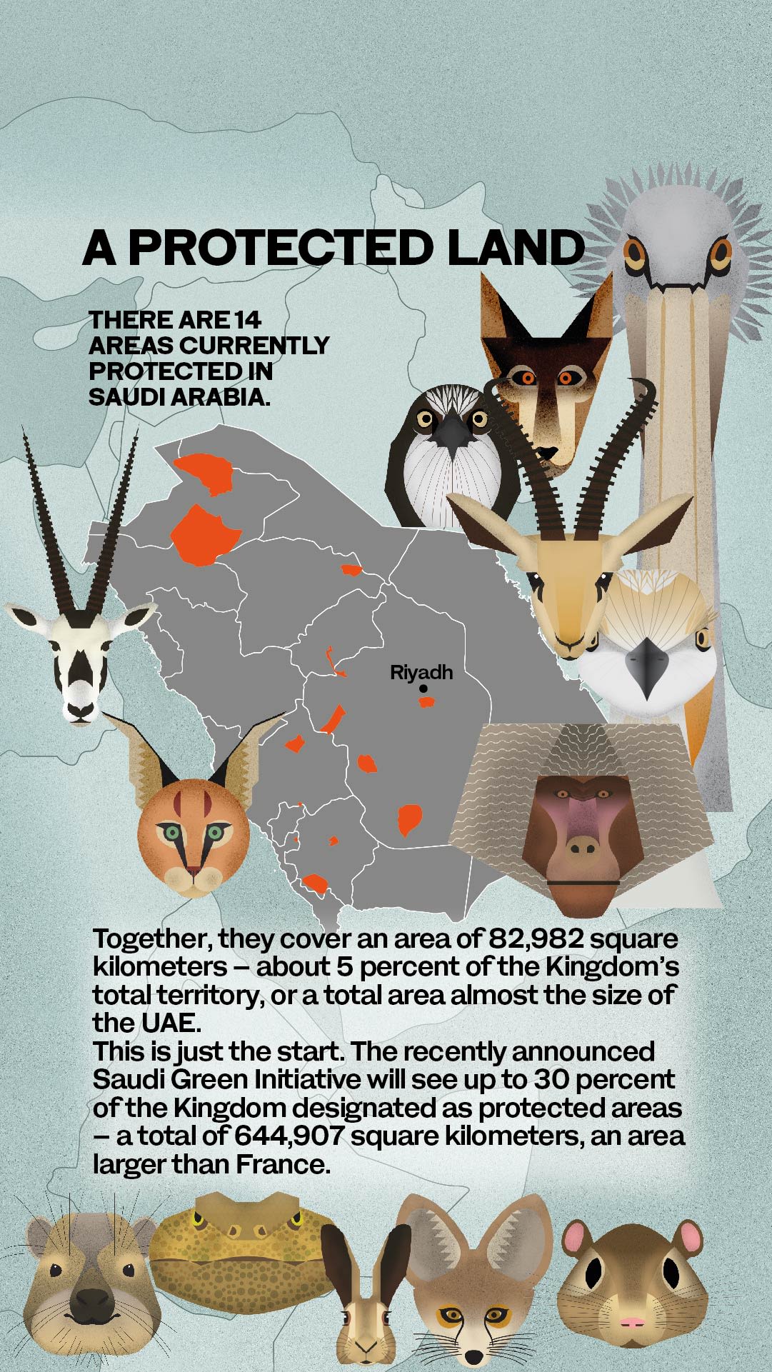 As part of the Saudi Green Initiative, announced in March 2021, rewilding initiatives are under way across the Kingdom, including the reversal of desertification across vast areas, the restoration of habitats degraded by livestock overgrazing, and a huge planned increase in the number and scale of protected areas.
