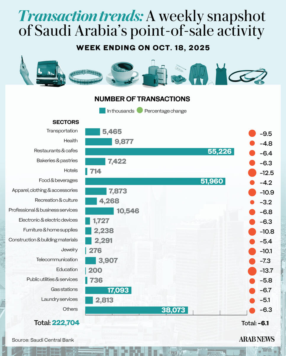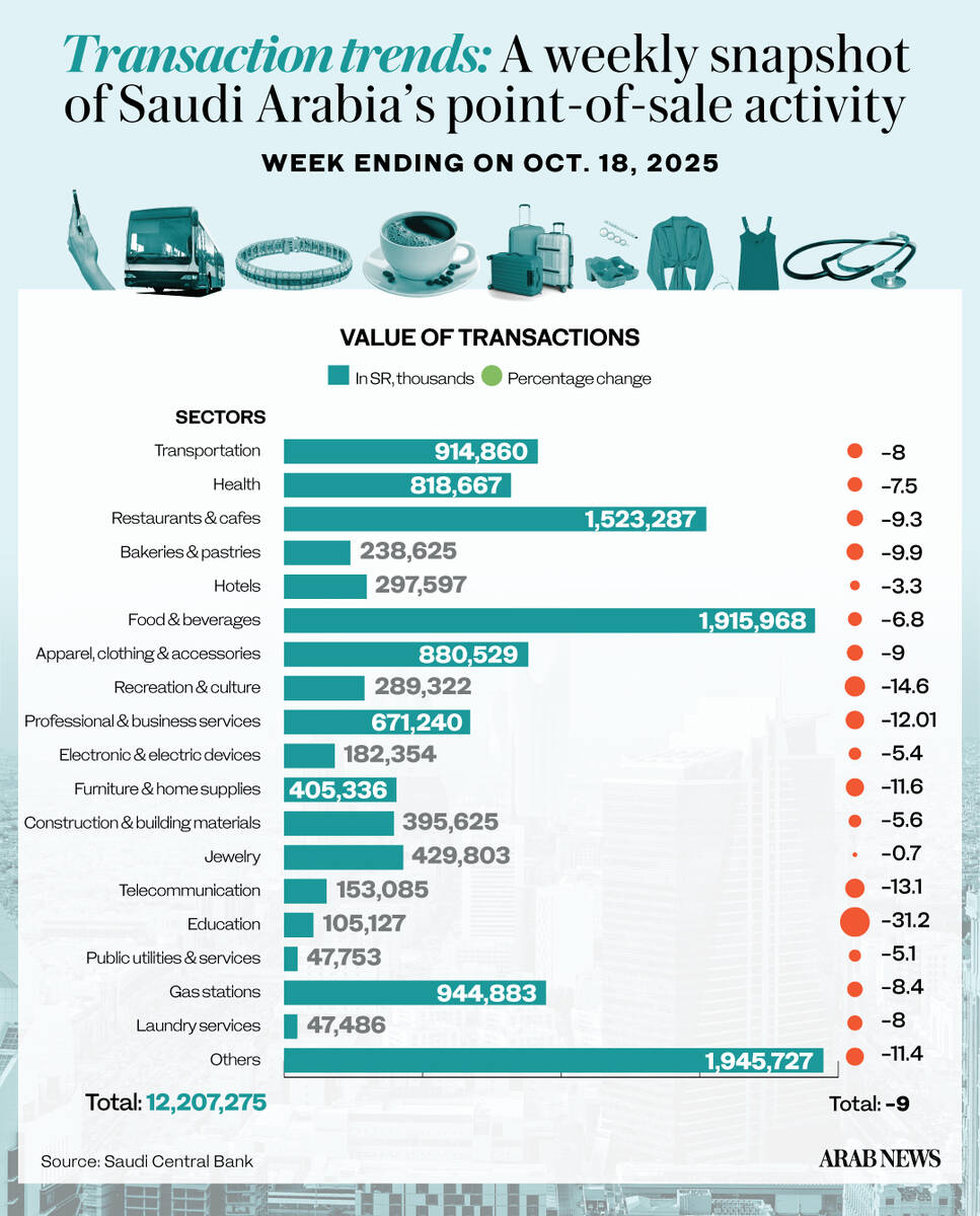 RIYADH: Saudi Arabia’s point-of-sale transactions remained above the $3 billion mark for the third consecutive week, underscoring the resilience of consumer activity even as overall spending moderated in mid-October.