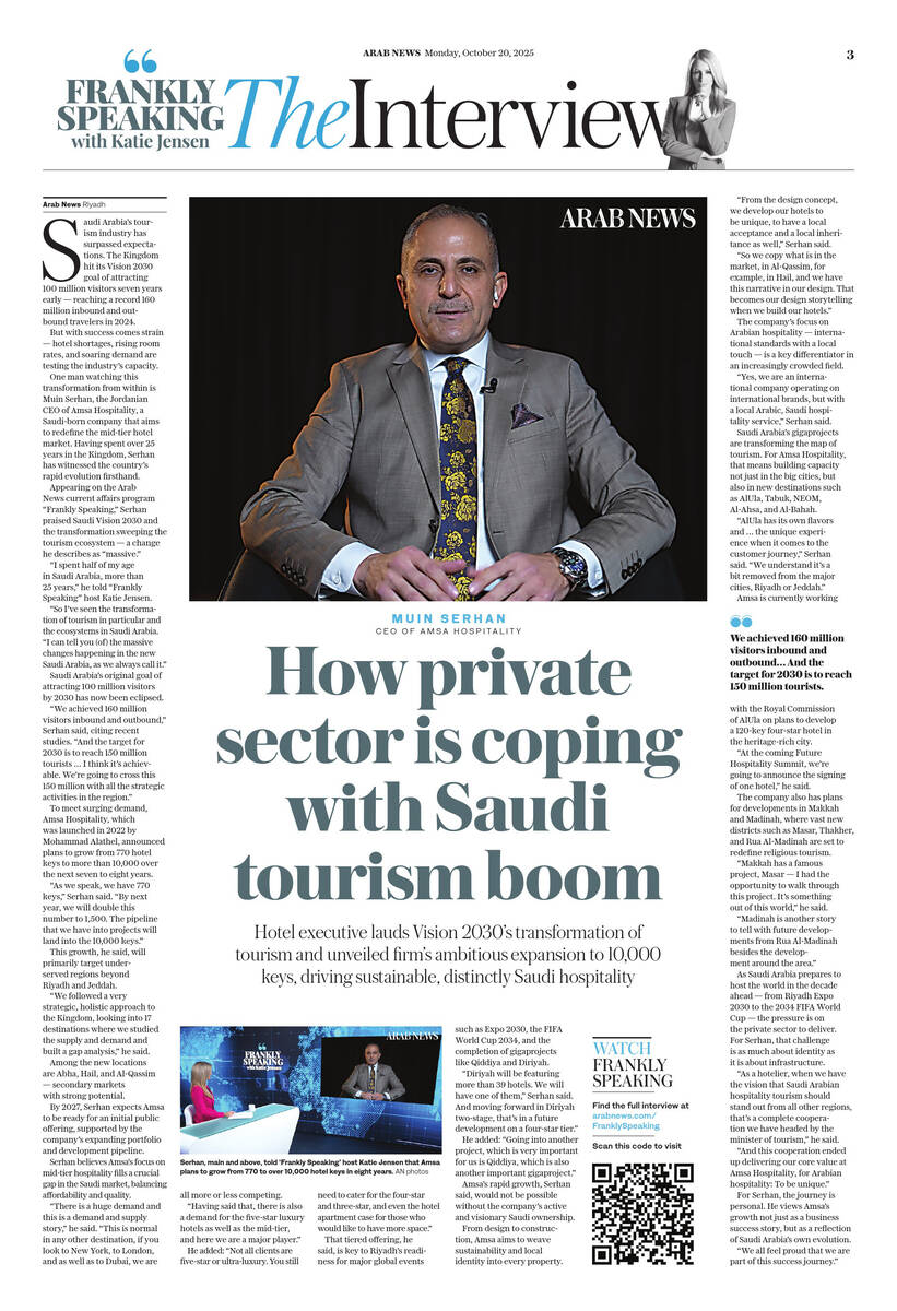 Appearing on the Arab News current affairs program “Frankly Speaking,” Serhan praised Saudi Vision 2030 and the transformation sweeping the tourism ecosystem — a change he describes as “massive.”