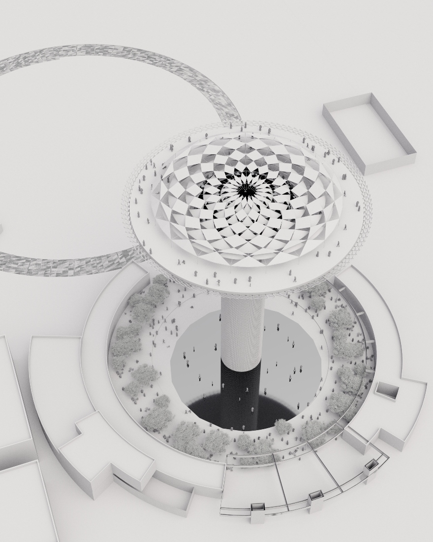 Another central principle is reversibility. The bioclimatic facade is designed as a lightweight, removable structure, non-invasive to the original building — allowing full restoration of the water tower if needed, in a spirit of heritage preservation and architectural temporality.